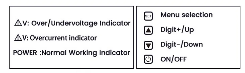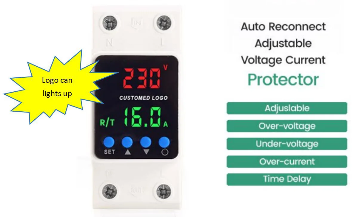 Overvoltaj qiymatini, kamsitilmagan qiymat va joriy himoya qiymatini qo'lda sozlash mumkin (menyuni kiritish uchun 5 soniya o'rnatish tugmachasini bosing va ushlab turing). Siz shuningdek displey rejimini o'rnatishingiz va hatto kompaniyangiz logotipining displeyini sozlashingiz mumkin!