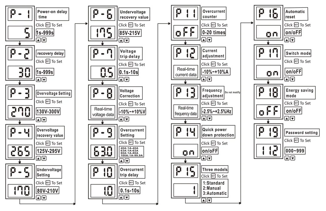 DC elektr ta'minoti ostida mavjud emas, faqat kuchlanish mavjud emas. P15 parametrlari uchun uchta displey rejim mavjud: 1-rejim p1-p19 parametrlarini ko'rsatadi; Mode 2 (Qo'llanma) Foydalanuvchi kuchlanishni (-P-), joriy (-N-), joriy (-H-) ni bosib yoki tugmachasini bosib ushlab turishga imkon beradi; Mode 3 (avtomatik) Voltaj (-U-), quvvat (-p-), joriy (A.) va chastota (-H-) ni avtomatik ravishda namoyish qiladi. P19 parametrlari uchun (parol), dastlabki parol 112 ga o'rnatiladi. Siz blokirovka parametrlarini o'zgartirgandan so'ng parolni tiklashingiz mumkin. Qulfni ochish uchun parametrlar asl parolga (112) tiklanishi kerak.